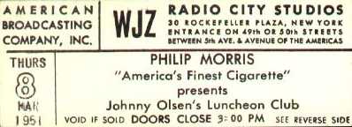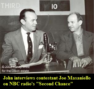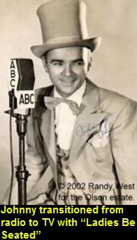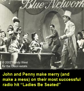 in Queens; the network brass was listening as well. When former hosts Ed East and Polly departed their ABC daytime radio show “Ladies Be Seated” in 1944, Johnny and Penny inherited the popular audience participation program. John recalled, “I was master of ceremonies on the show, often working in a glittering minstrel costume. Penny was Associate Producer... she did a masterful job of obtaining prizes, choosing interesting participants from the studio audience and seeing that everything happened on time”. John became one of the city’s busiest radio performers. By 1949 he was presiding over 20 half-hour shows each week. They included “Johnny Olson’s Get Together” from the WJZ Playhouse on West 48th Street, “Johnny Olson’s Prince Charming” from the Mutual Guild Theater on West 52nd Street, and a pairing with Arlene Francis at the network’s prestigious Radio City Studios for “What’s My Name?” “Ladies Be Seated” aired afternoons at 2:30 over the Blue Network’s flagship WJZ in New York. Locally, the competition was “Young Doctor Malone” on WABC, “Women in White” on NBC’s WEAF, and local news broadcasts on both WNEW and Mutual’s WOR. Johnny and Penny often topped the ratings, and the show ran for five years. Press kits from the program describe the show as “audience participation at its best… where good sportsmanship and a sense of fun for the participants and spectators are the ingredients that pay off handsomely in attractive prizes”. Supporting players on “Ladies Be Seated” included Penny who joined John for what the press releases referred to as the program’s “hi-jinx”. She authored the humorous “Penny Mystery” skits - sequences featuring detective clues that audience members puzzled over as they vied for prizes by trying to solve Penny’s fun mysteries. The show’s writer-director, Billy Redford, played the character “Professor Schnaaps”, while Al Greiner was billed as Musical Director, accompanying the action and providing transition music on the studio organ. The announcer was “good-looking and smooth talking” Bob Maurer, “the most eligible bachelor ever to leave Freeport, Illinois”.