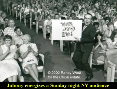 Audience warm-ups were a part of broadcasting from the earliest days of radio, beginning when members of the public were first invited to view a broadcast from the studio. Early on, warm-ups consisted simply of a word of welcome from the producer, an introduction of the cast, an occasional question and answer session hosted by a staff member, and/or a rousing musical number if the program featured a live band. Johnny Olson helped raise this pre-show mood setting session to an art form. The importance of this unique skill to the success of a program, and John’s pride in his proficiency are reflected in the design of his business card from the 1970s. On it, he enumerates three talents: TV Announcer, Warm-up Specialist, and Audience Host. John had learned from experience the importance of working to an attentive, receptive and reactive audience; one that could even be cajoled into laughing and applauding on cue. He developed a warm-up act that could reduce the inhibitions of even the most staid audience members, and create a wild, party-like atmosphere. He was the subject of many newspaper write-ups and broadcast interviews for his excellence in this job that is a strange hybrid of entertainer, party host, psychotherapist, cheerleader and den mother. Being the youngest of eleven children apparently helped. John said, “In a family that size you’ve got to learn how to give and take, how to appreciate the tastes and peculiarities of others, and that’s really the basis of understanding people.” In another serious reflection on the science of making merry Johnny wrote, “I am not a jokester, I leave that to the star. I don’t want to step on his toes. I just try to get the audience in a receptive mood… if the studio audience reacts well, it can help a star in his timing”.