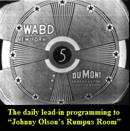 success. DuMont was another pioneering company in the new business of television broadcasting. Allen Balcom DuMont’s WABD had been on the air in New York since 1939 with experimental broadcasts designed primarily to help sell the firm’s TV receiving sets. John Olson’s was a frequently seen face and an important part of the fledgling network’s programming until its demise in 1955. John was proud to say he hosted the first daytime network television show to originate from New York, “Johnny Olson’s Rumpus Room” which aired daily on DuMont from 1949 through 1952. “We aired in New York, Philadelphia, Baltimore, Washington and Pittsburgh. That’s as far as the cable went. Milton Berle was the force that brought the cable coast to coast.”